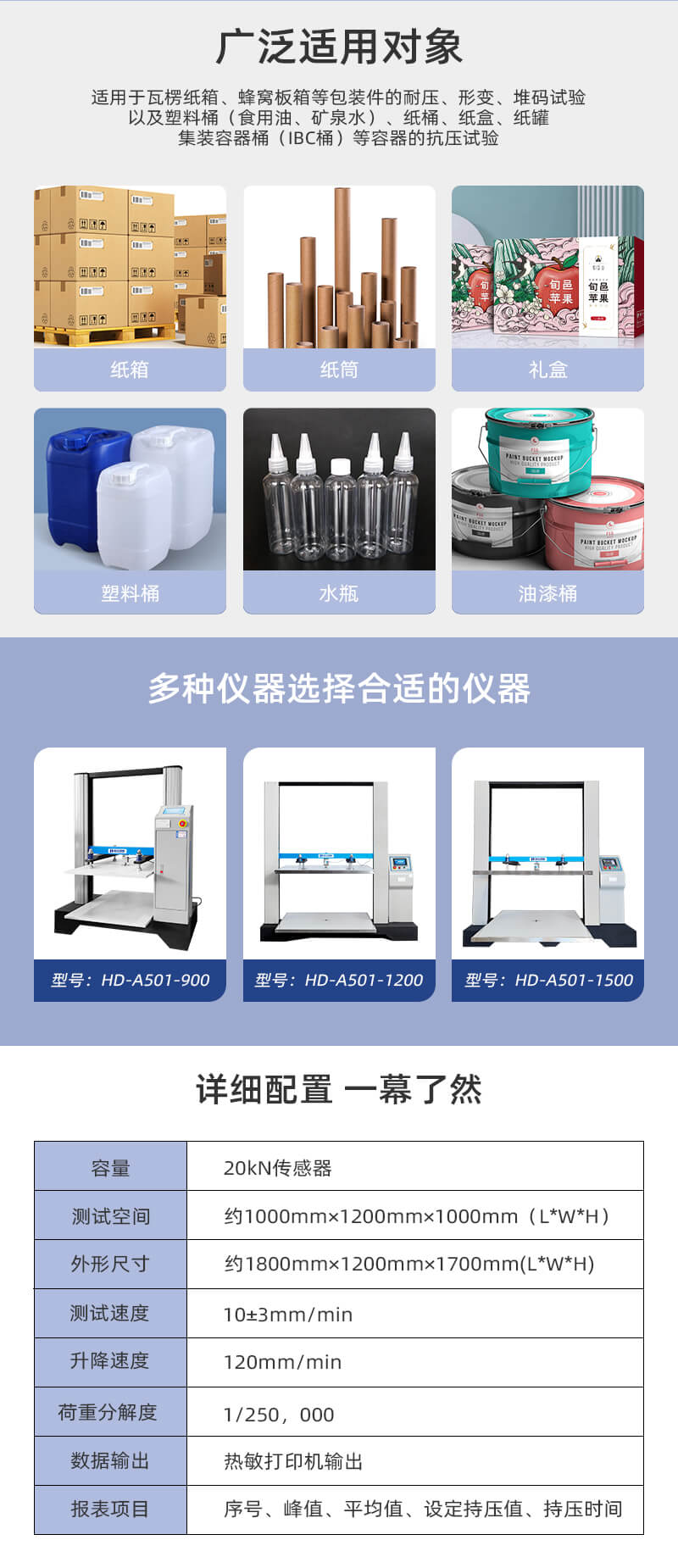 微電腦式紙箱抗壓試驗(yàn)機(jī)是專業(yè)用于測試紙箱抗壓性能的試驗(yàn)機(jī),適用于瓦楞紙箱、蜂窩板箱等包裝件的耐壓、形變、堆碼試驗(yàn),以及塑料桶(食用油、礦泉水)、紙桶、紙盒、紙罐、集裝容器桶(IBC桶)等容器的抗壓試驗(yàn)。