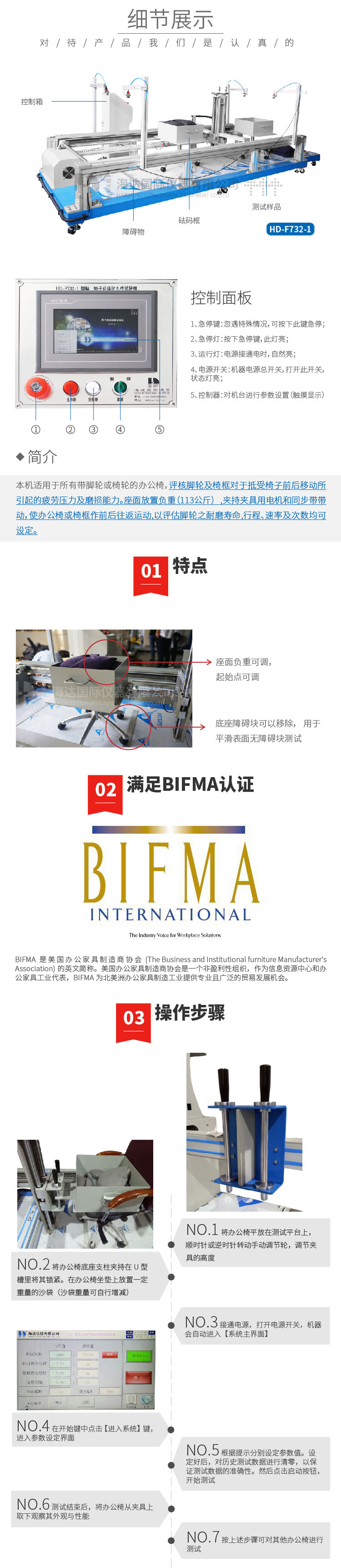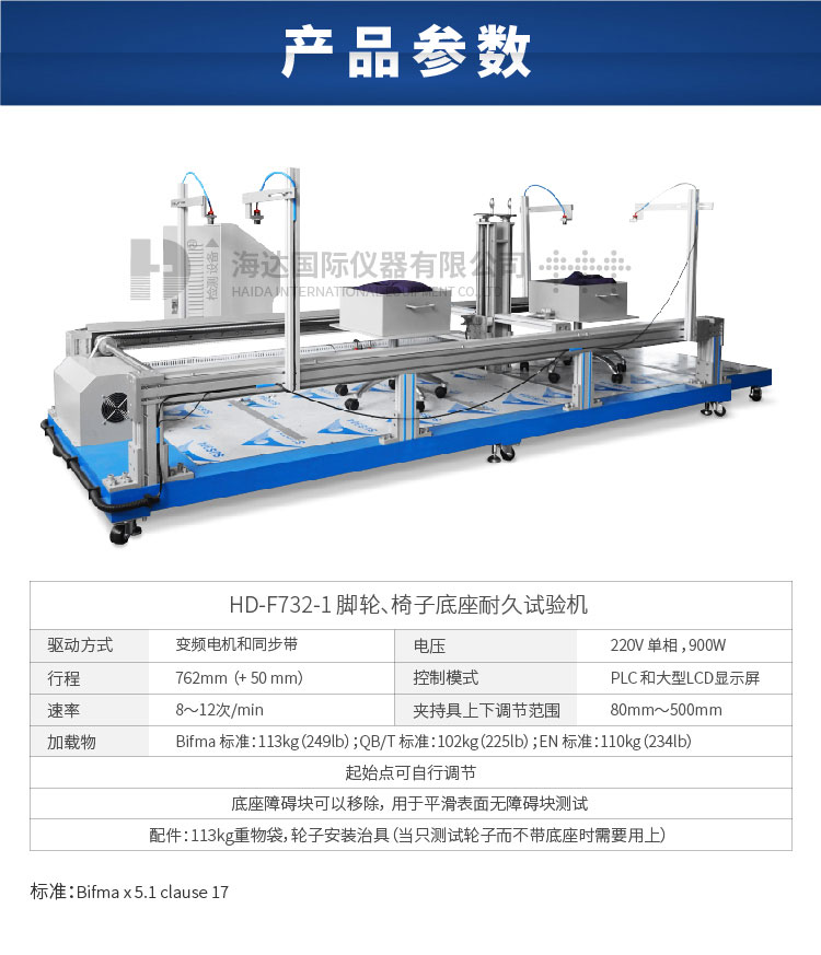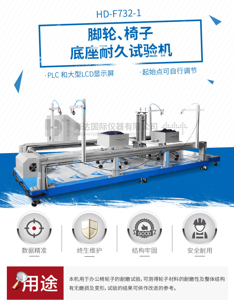 辦公椅輪子耐磨試驗儀適用于所有底座配備萬向輪的椅子。用于評估辦公椅腳輪在負載狀態(tài)下移動的耐久能力。分有障礙和無障礙兩種測試方式,有障礙測試指辦公椅座面放置負荷,施力循環(huán)裝置,作左右往復推拉動作,行程及時間、次數均可設定。