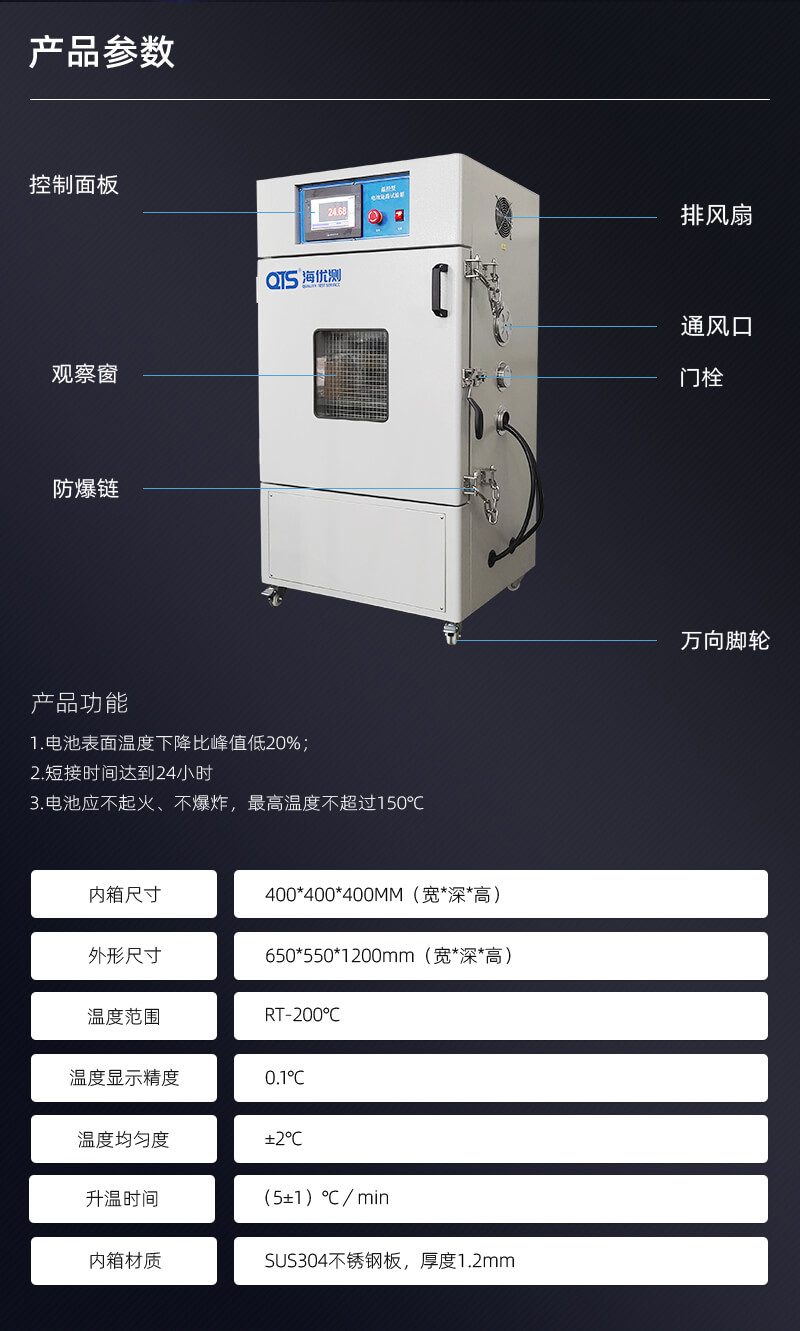 將充滿電的電池,放置一定的環(huán)境中,然后用導(dǎo)線連接電池正負(fù)極端,并保證全部外部電阻值嗎,試驗(yàn)過(guò)程中監(jiān)測(cè)電池表面溫度變化,當(dāng)出現(xiàn)下兩種情形之一時(shí),試驗(yàn)終止:電池應(yīng)不起火、不爆炸,最高溫度不超過(guò)150℃。