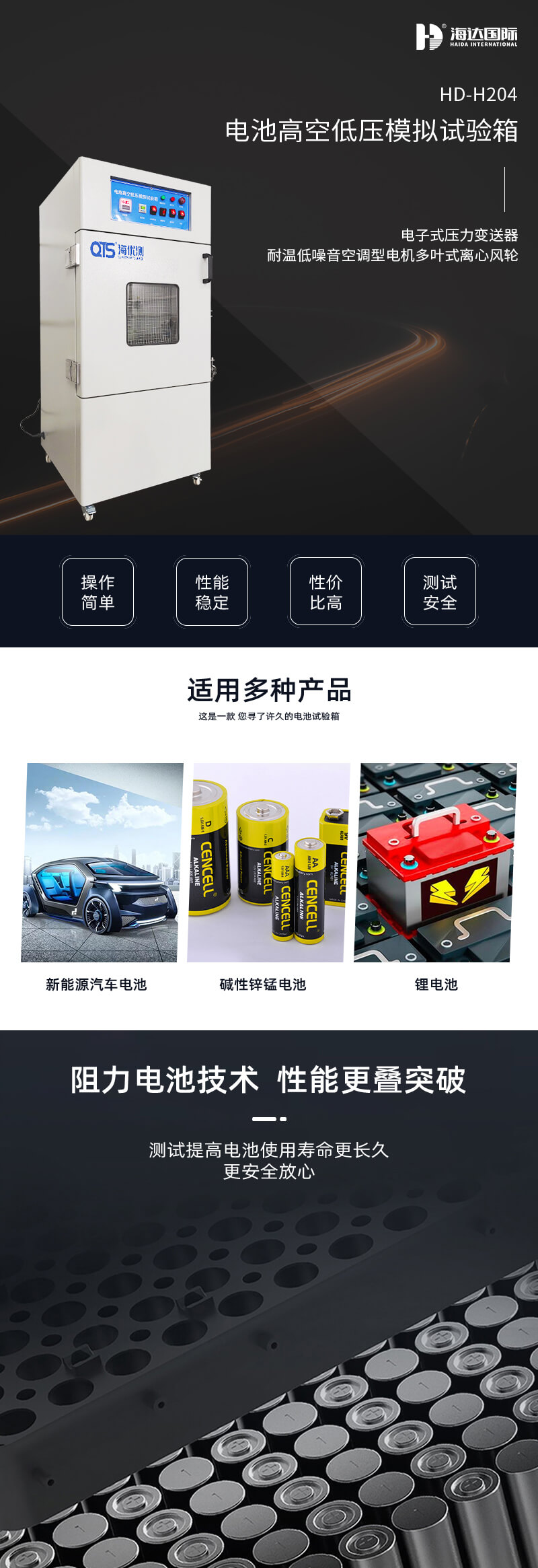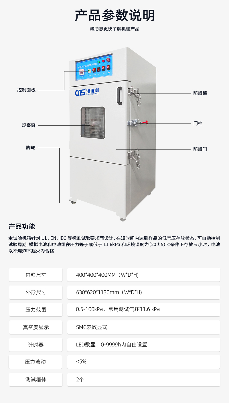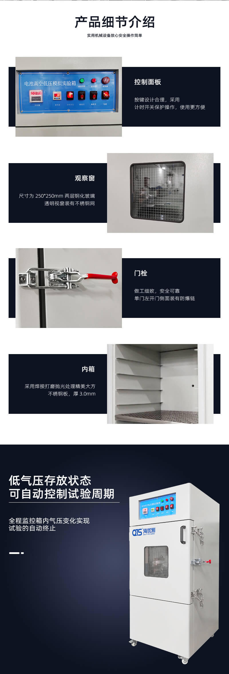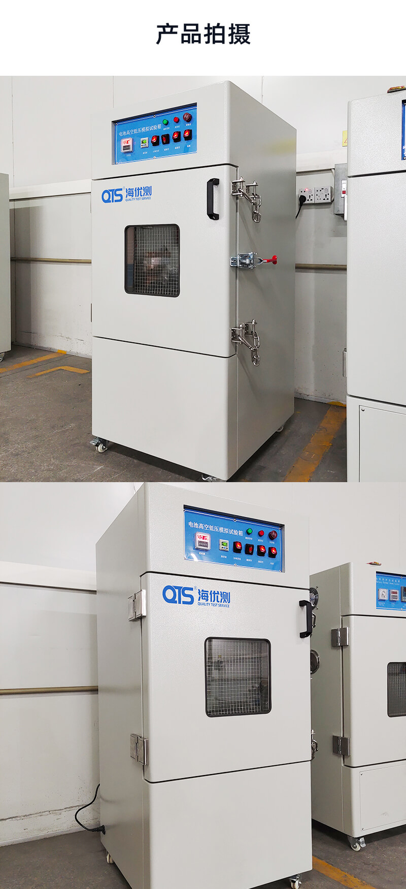 電池高空低壓模擬試驗箱針對UL、EN、IEC等標準試驗而設計,在短時間內達到樣品的低氣壓存放狀態,可自動控制試驗周期,全程監控箱內氣壓變化,實現試驗的自動終止。模擬電池和電池組在壓力等于或低于11.6kPa和環境溫度為(20±5)℃條件下存放6小時,電池以不爆炸不起火為合格。