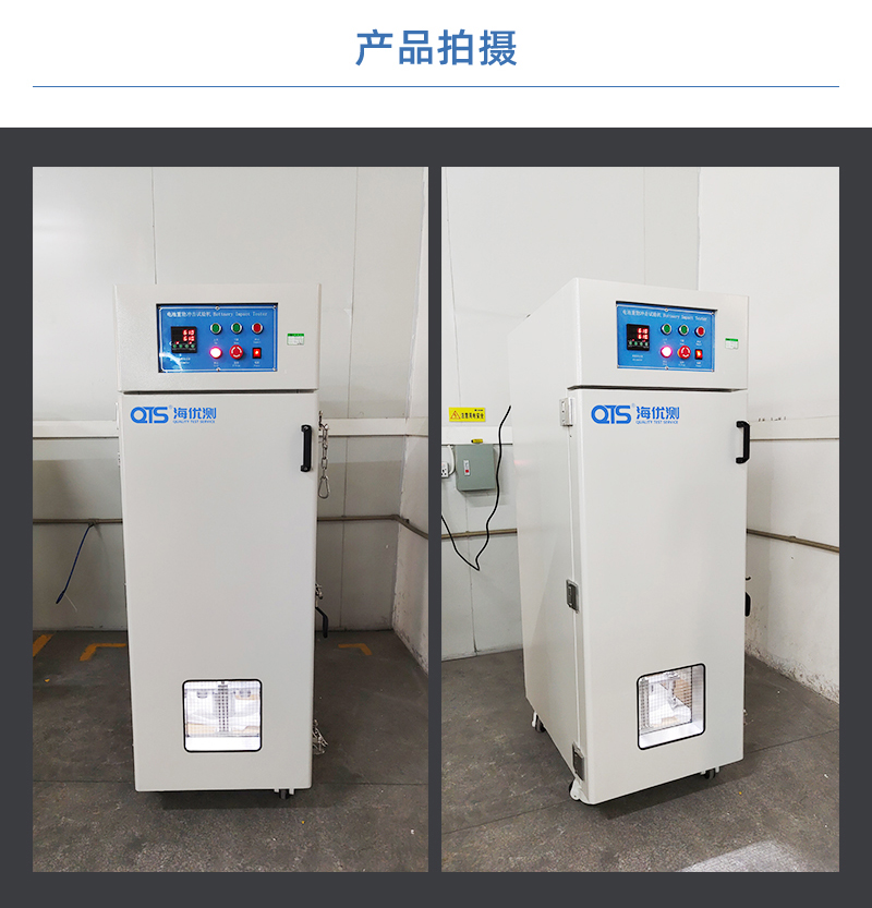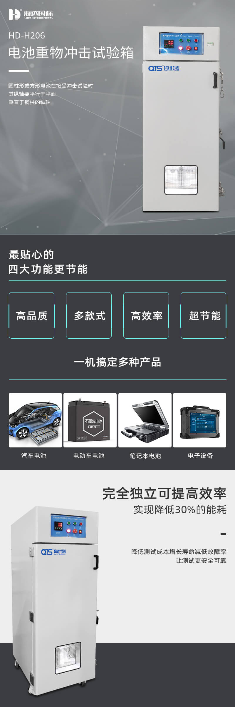 試驗樣品電池要放在一平面上,重物從一定高度(610mm 或1000mm)跌落到樣品上。圓柱形或方形電池在接受沖擊試驗時,電池的最長軸垂直于鋼柱,最大面垂直于沖擊方向,每只電池只接受一次沖擊試驗。電池不起火,不爆炸為合格。