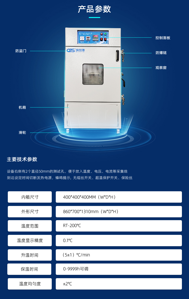 電池熱沖擊試驗箱是模擬電池放置在自然對流或強制通風的高溫箱中,以一定的升溫速率升溫至設定測試溫度并保持一定時間,采用熱風循環系統,可保證工作溫度分布均勻。