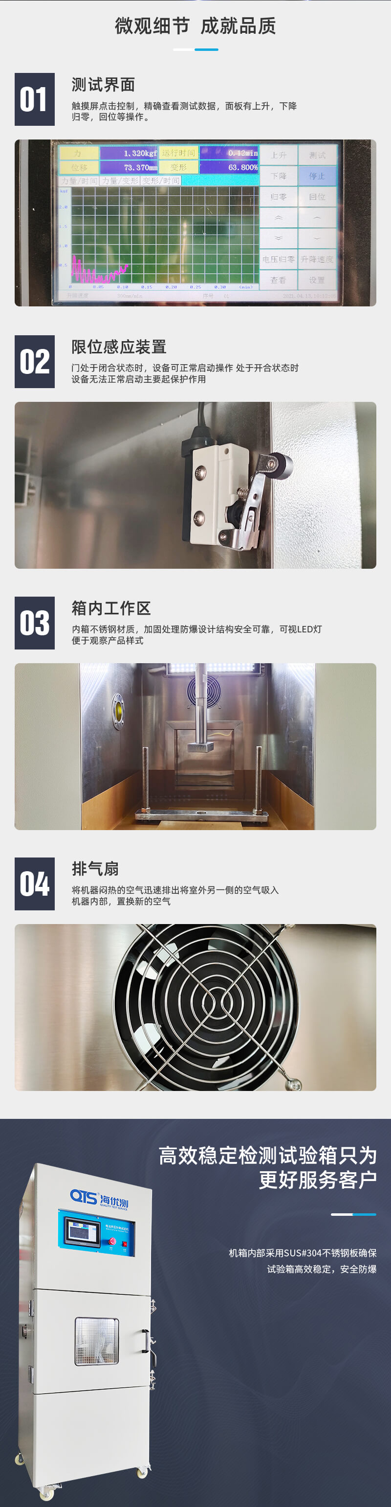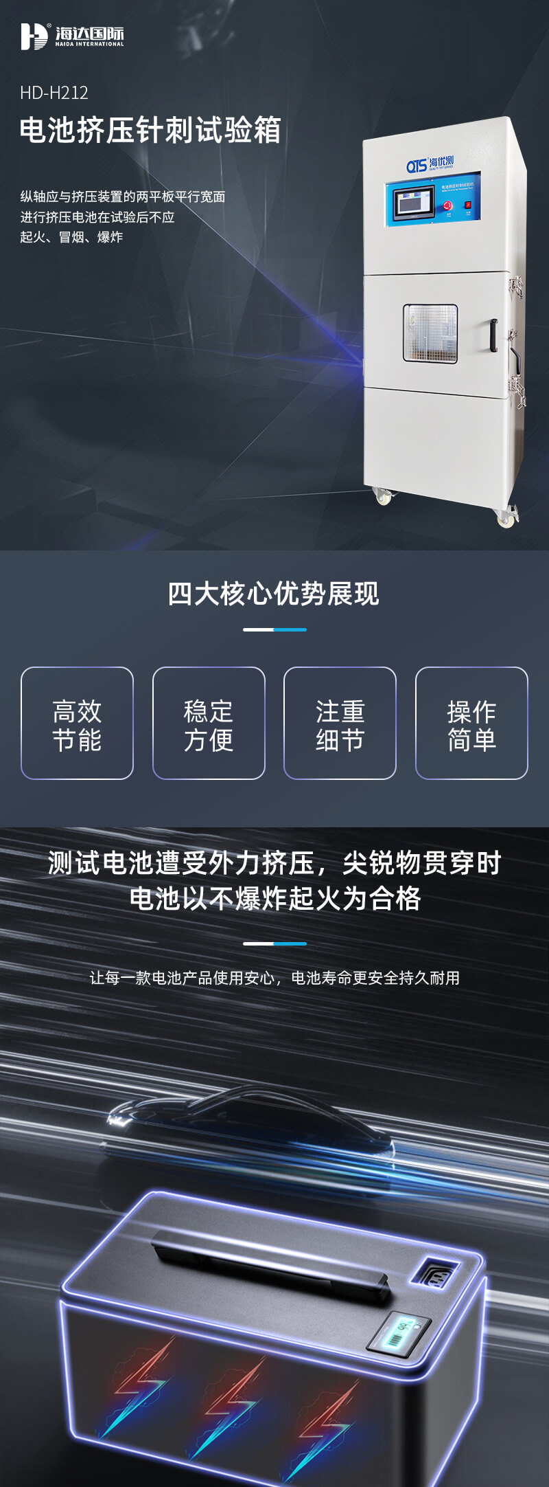 HD-H212電池擠壓針刺試驗箱適用于模擬各類電池在使用,運輸,儲存或處理家庭廢物時,電池遭受擠壓和針刺的情形,用直徑2-8mm的無蝕銹鋼針以25mm/s的速度刺穿電池最大表面的中心位置,保持任意時間并觀察其測試結(jié)果,電池不爆炸、不起火為合格。